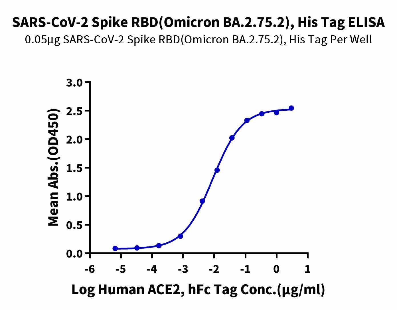 | Bio-activity : | Immobilized SARS-CoV-2 Spike RBD (Omicron BA.2.75.2), His Tag at 0.5μg/ml (100μl/well) on the plate. Dose response curve for Human ACE2, hFc Tag with the EC50 of 8.9ng/ml determined by ELISA. |