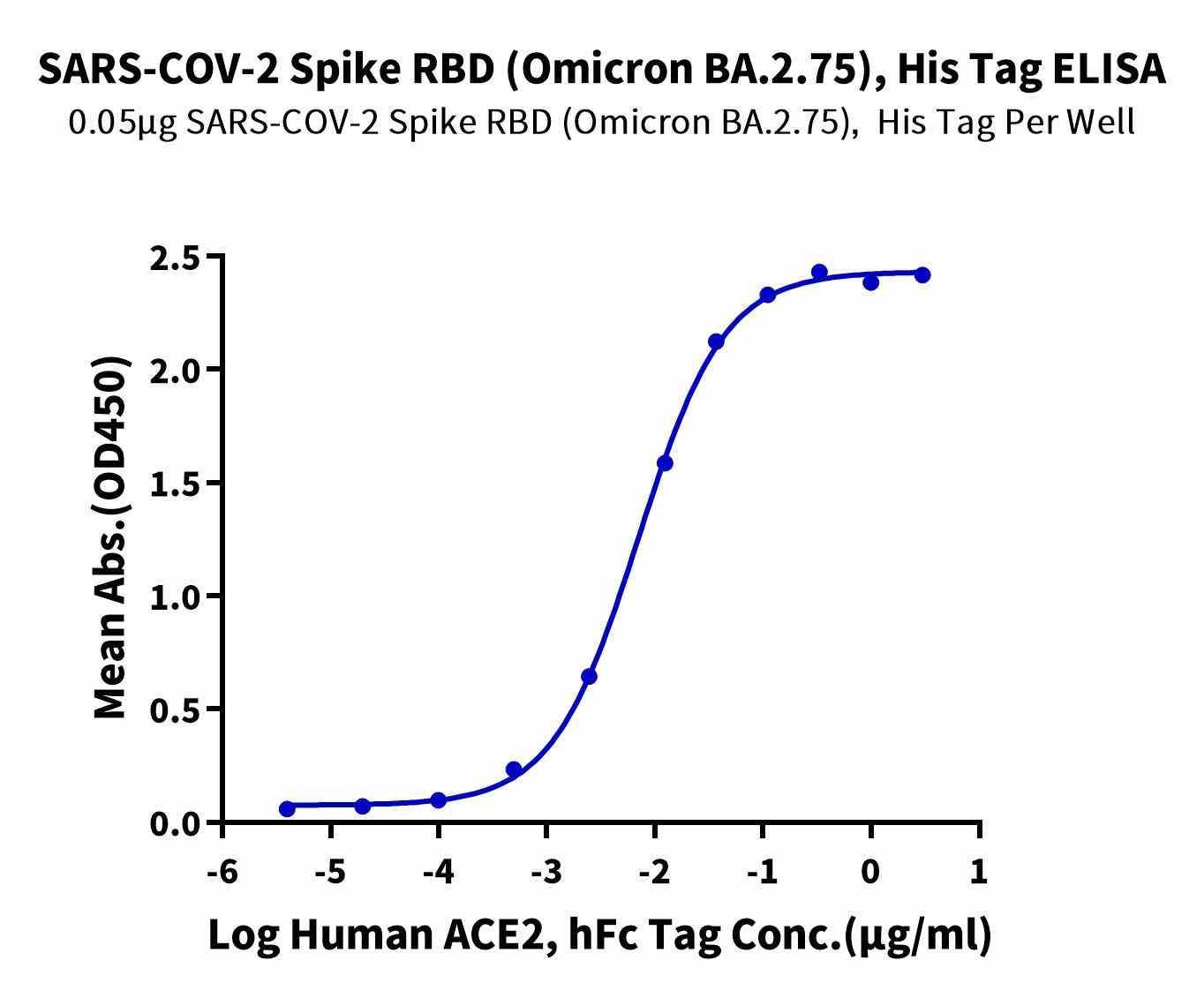 | Bio-activity : | Immobilized SARS-COV-2 Spike RBD (Omicron BA.2.75), His Tag at 0.5μg/ml (100μl/Well) on the plate. Dose response curve for Human ACE2, hFc Tag with the EC50 of 7.0ng/ml determined by ELISA. |
