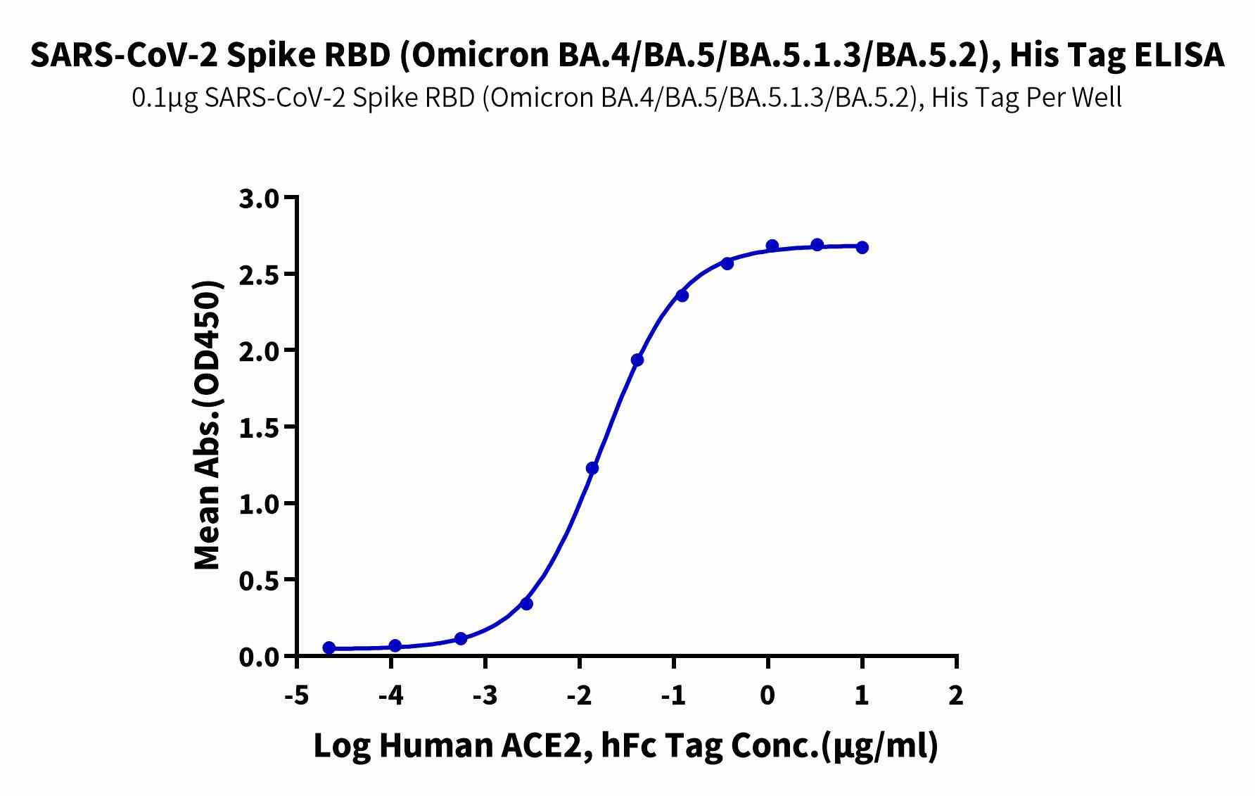 | Bio-activity : | Immobilized SARS-CoV-2 Spike RBD (Omicron BA.4/BA.5/BA.5.1.3/BA.5.2), His Tag at 1μg/ml (100μl/Well) on the plate. Dose response curve for Human ACE2, hFc Tag with the EC50 of 17.3ng/ml determined by ELISA. |