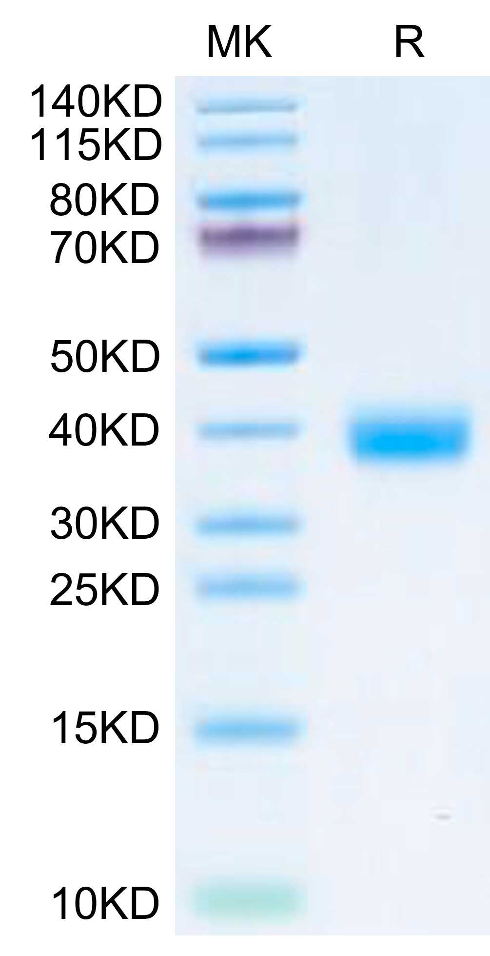 | Molecular Mass : | The protein has a predicted MW of 25.99 kDa. Due to glycosylation, the protein migrates to 35-43 kDa based on Tris-Bis PAGE result. |