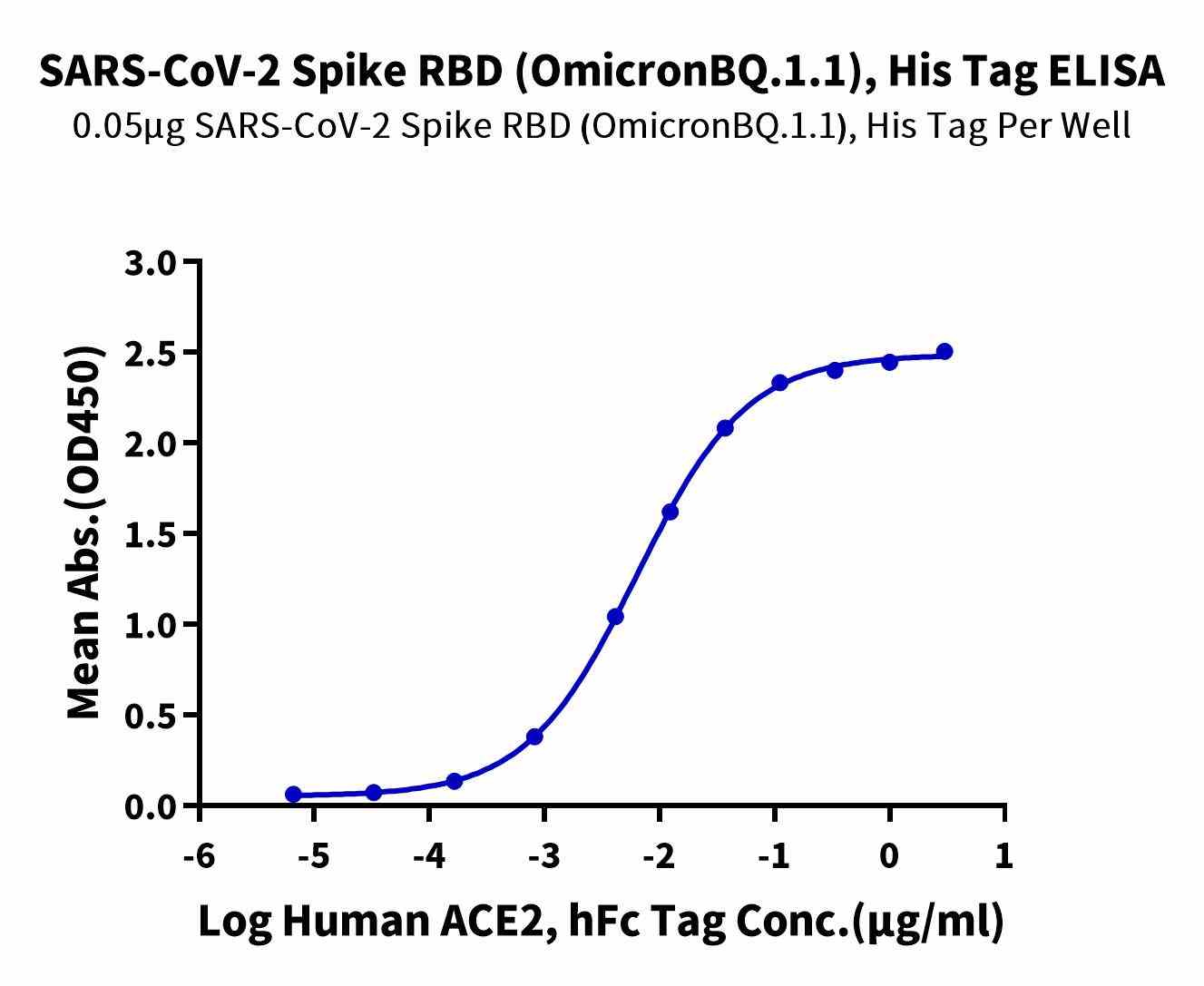 | Bio-activity : | Immobilized SARS-CoV-2 Spike RBD (Omicron BQ.1.1), His Tag at 1μg/ml (100μl/Well) on the plate. Dose response curve for Human ACE2, hFc Tag with the EC50 of 6.3ng/ml determined by ELISA. |