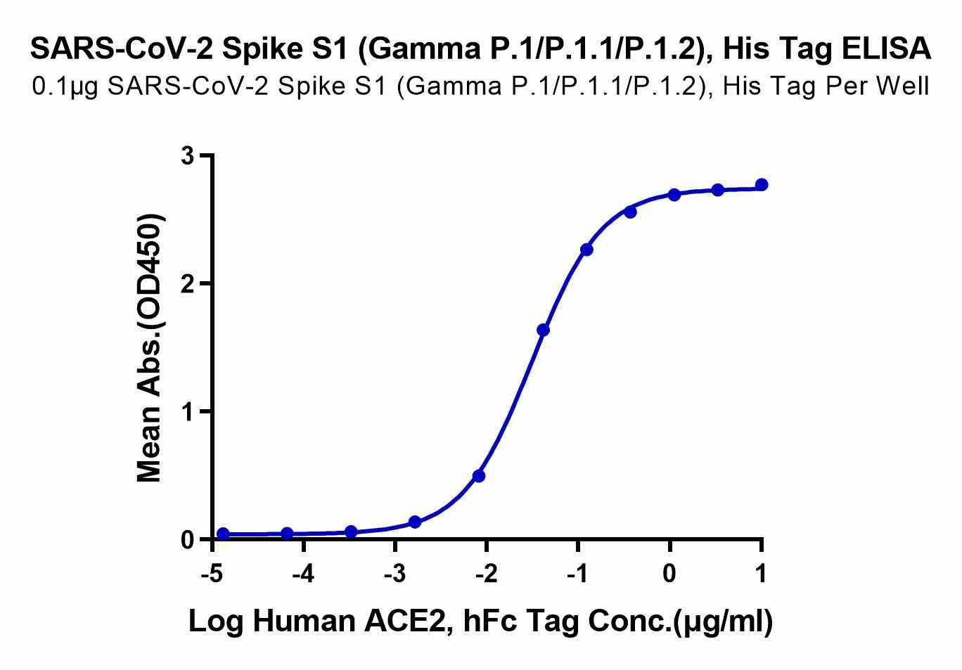 | Bio-activity : | Immobilized SARS-CoV-2 Spike S1 (Gamma P.1/P.1.1/P.1.2), His Tag at 1μg/ml (100μl/Well) on the plate. Dose response curve for Human ACE2, hFc Tag with the EC50 of 31.1ng/ml determined by ELISA. |