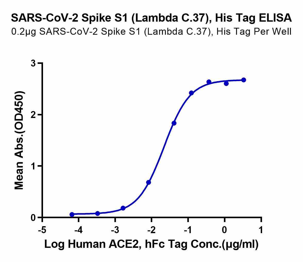 | Bio-activity : | Immobilized SARS-CoV-2 Spike S1 (Lambda C.37), His Tag at 2μg/ml (100μl/well) on the plate. Dose response curve for Human ACE2, hFc Tag with the EC50 of 21.8ng/ml determined by ELISA. |