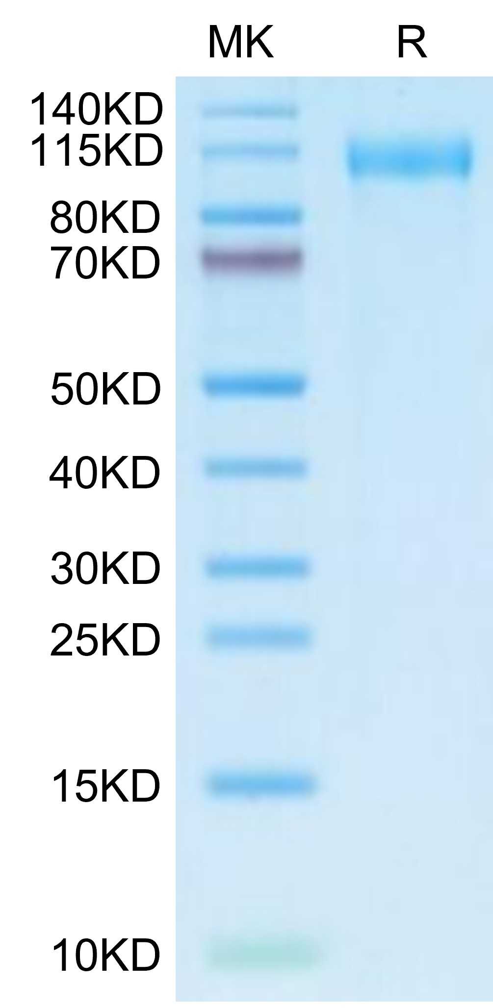 | Molecular Mass : | The protein has a predicted MW of 76.05 kDa. Due to glycosylation, the protein migrates to 100-120 kDa based on Tris-Bis PAGE result. |