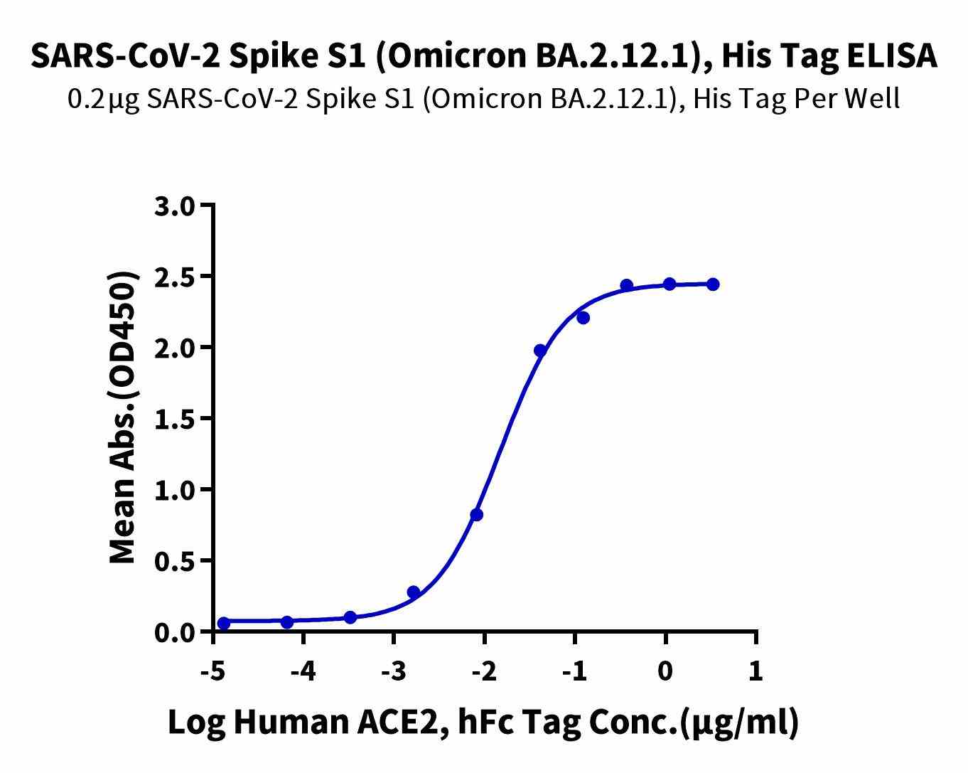 | Bio-activity : | Immobilized SARS-CoV-2 Spike S1 (Omicron BA.2.12.1), His Tag at 2μg/ml (100μl/well) on the plate. Dose response curve for Human ACE2, hFc Tag with the EC50 of 14.7ng/ml determined by ELISA. |