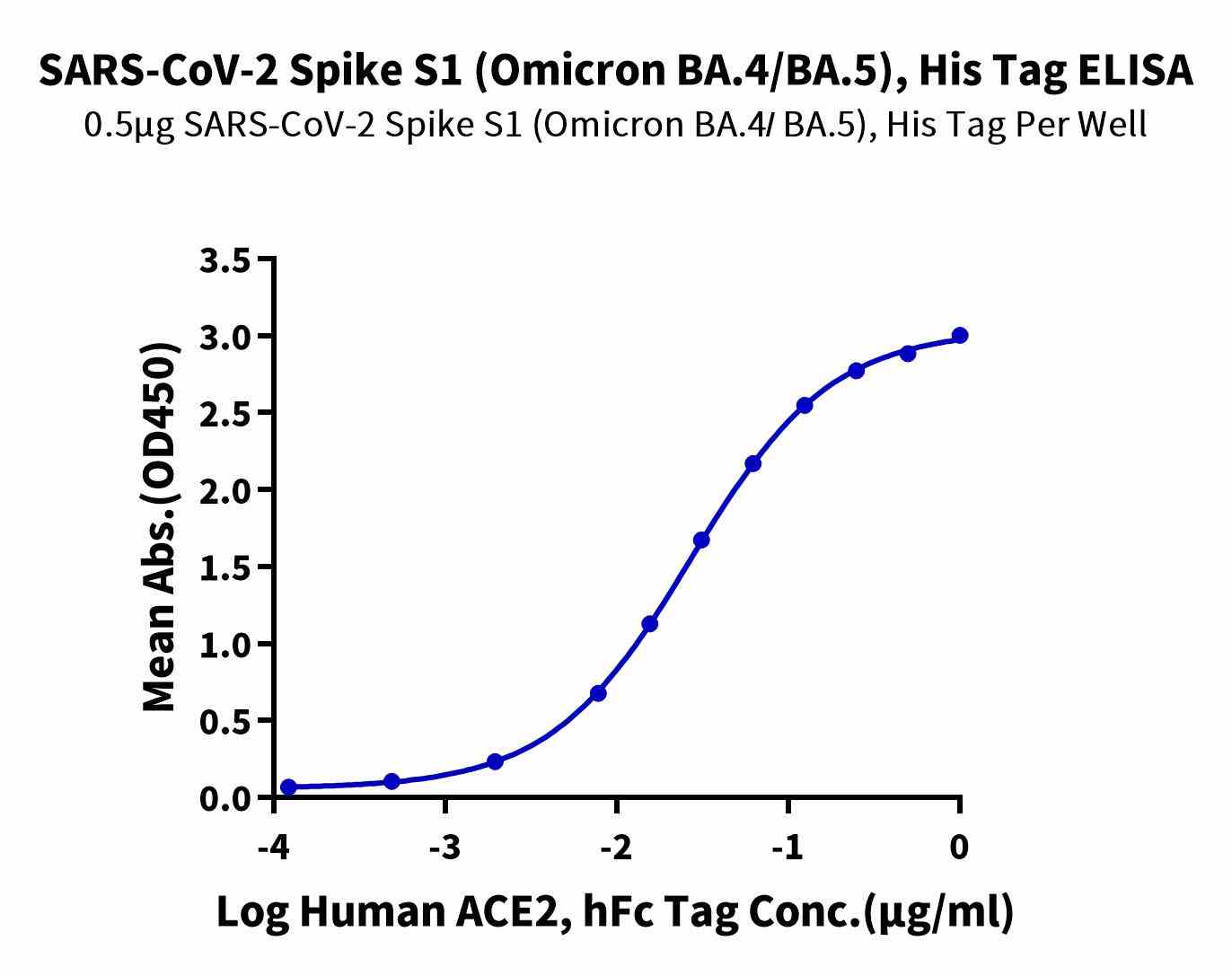 | Bio-activity : | Immobilized SARS-CoV-2 Spike S1 (Omicron BA.4/BA.5/BA.5.2), His Tag at 5μg/ml (100μl/Well) on the plate. Dose response curve for Human ACE2, hFc Tag with the EC50 of 27.0ng/ml determined by ELISA. |