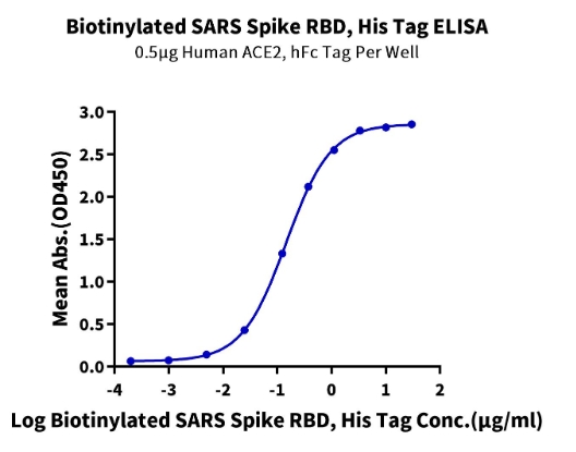 | Bio-activity : | Immobilized Human ACE2, hFc Tag at 5μg/ml (100μl/well) on the plate. Dose response curve for Biotinylated SARS Spike RBD, His Tag with the EC50 of 0.17μg/ml determined by ELISA. |