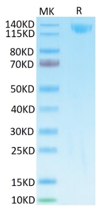 | Molecular Mass : | The protein has a predicted MW of 100.6 kDa. Due to glycosylation, the protein migrates to 120-140 kDa based on Tris-Bis PAGE result. |