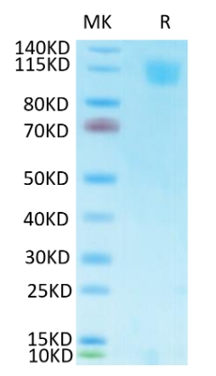 | Molecular Mass : | The protein has a predicted MW of 75.9 kDa. Due to glycosylation, the protein migrates to 120-140 kDa based on Tris-Bis PAGE result. |