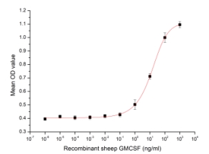 Granulocyte-macrophage colony-stimulating factor (GM-CSF), also known as colony-stimulating factor 2 (CSF2), is a monomeric glycoprotein that functions as a cytokine — it is a white blood cell growth factor. GM-CSF also has some effects on mature cells of the immune system. These include, for example, inhibiting neutrophil migration and causing an alteration of the receptors expressed on the cells surface. Besides,the proliferation of TF-1 cell line GM-CSF basic-dependent, thus, the activity of GM-CSF is usually measured by a cell proliferation assay using TF-1 cells. TF-1 cells were seeded into triplicate wells of 96-well plates at a density of 8,000 cells/well with 2% serum standard 1640 which contains various concentrations of recombinant sheep GM-CSF. After incubated for 2 days, cells were observed by inverted microscope and cell proliferation was measured by Cell Counting Kit-8 (CCK-8). Briefly, 10 µl of CCK-8 solution was added to each well of the plate, then the absorbance at 450 nm was measured using a microplate reader after incubating the plate for 2-4 hours at 37°C. Proliferation of TF-1 cells after incubation with GM-CSF for 2 days observed by inverted microscope was shown. Cell viability was assessed by CCK-8 (Cell Counting Kit-8 ) assay after incubation with recombinant sheep GM-CSF for 2 days. It was obvious that GM-CSF significantly increased cell viability of TF-1 cells. The ED50 is 13.9 ng/ml. |