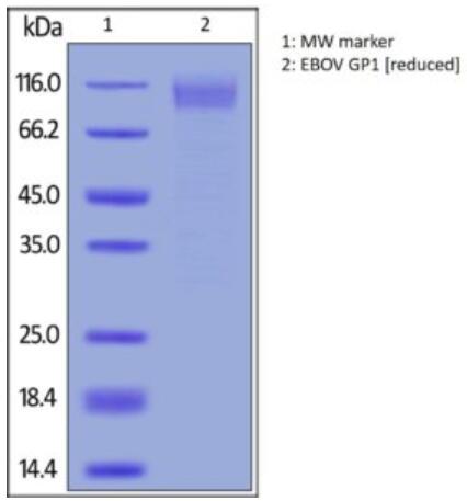 Product Overview : | Recombinant Ebolavirus EBOV (subtype Zaire, strain Kikwit-95) Envelope Glycoprotein 1(GP1), Ile 33 - Arg 501 was produced with a C-terminal His-tag in HEK293 cells. |
