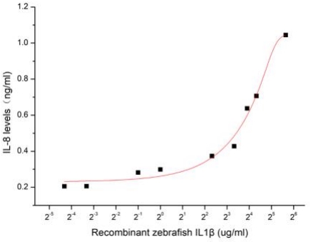 Interleukin 1 beta (IL-1β) also known as leukocytic pyrogen, leukocytic endogenous mediator, mononuclear cell factor, lymphocyte activating factor and other names, is a member of the interleukin 1 family of cytokines. This cytokine is an important mediator of the inflammatory response, and is involved in a variety of cellular activities, including cell proliferation, differentiation, and apoptosis. It has been reported that IL-1β can induced IL-8 production in A549 cells. To test the bioactivity of recombinant zebrafish IL-1β, A549 cells were seeded into 24-well plate at a density of 1x10^5 cells/mL, and allowed to attach overnight before treated with certain concentrations of recombinant zebrafish IL-1β for 48h and IL-8 levels in the cell supernatant were determined by ELISA (SEA080Hu). IL-8 levels in the cell supernatant of A549 cells increased significantly after stimulated with IL-1β, the EC50 was 16.86 ug/ml. |