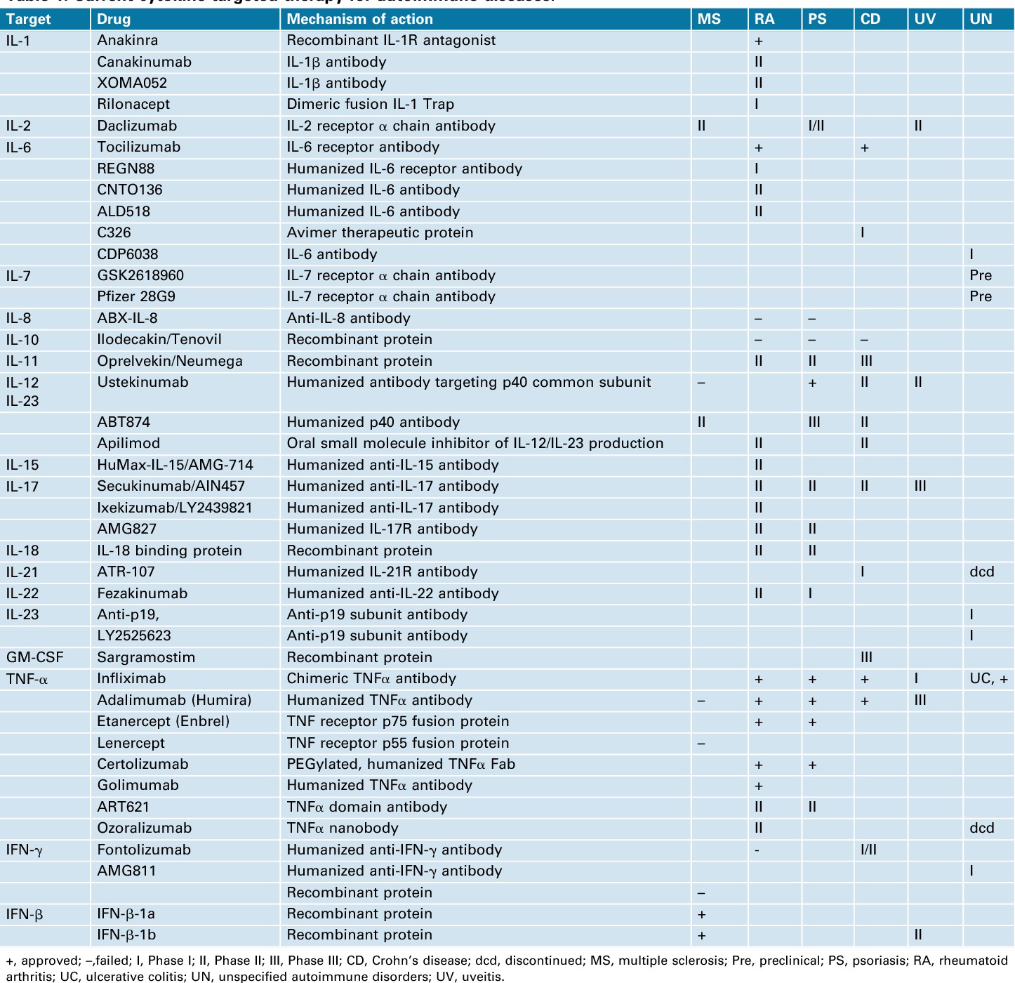 Table 1. Current cytokine-targeted therapy for autoimmune diseases. (Liu X, et al., 2013)
