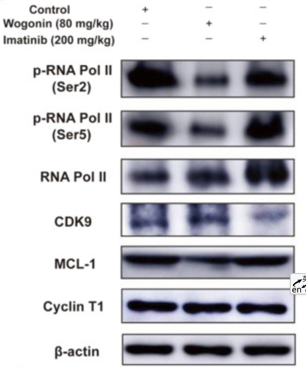 Fig2. The protein expression of p-RNA Pol II (Ser2), p-RNA Pol II (Ser5), CyclinT1, CDK9 and MCL-1 in KU-812 xenografts. β-actin was used as a loading control.