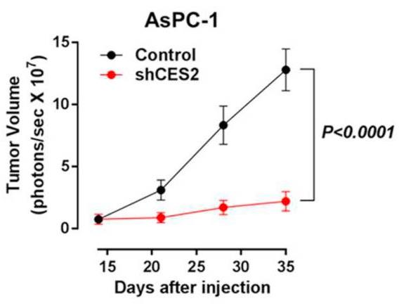 Fig1. The growth of AsPC-1 cells expressing high (control) or low (shCES2) level of CES2 in nude mice was monitored every week. -