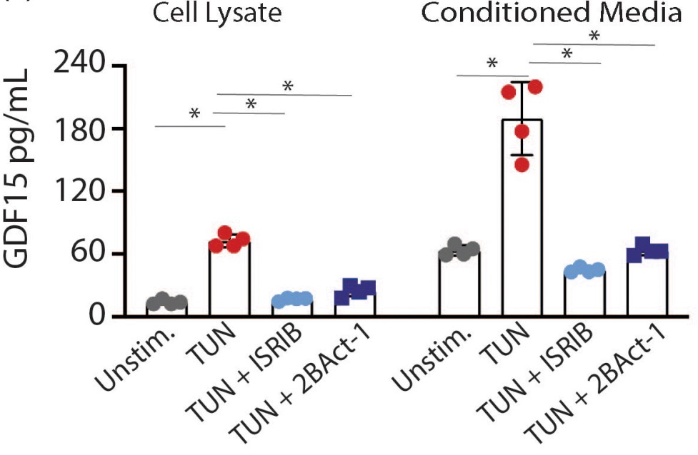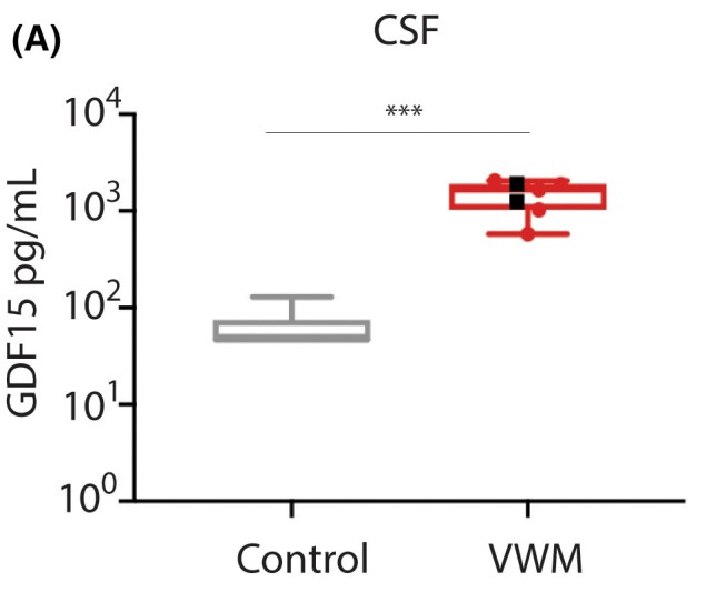 Characterize Growth Differentiation Factor 15 (GDF15) as a secreted biomarker of the integrated stress response (ISR) within the central nervous system (CNS). The researchers determined GDF15 levels utilizing in vitro and in vivo neuronal systems wherein the ISR was activated. Primarily, they used the murine model of vanishing white matter disease (VWMD), a neurological disease driven by persistent ISR in the CNS, to establish a link between levels of GDF15 in the cerebrospinal fluid (CSF) and ISR gene expression signature in the CNS. GDF15 was also determined in the CSF of VWM patients. GDF15 expression was increased concomitant to ISR activation in stress-induced primary astrocytes as well as in retinal ganglion cells following optic nerve crush, while treatment with 2Bact, a specific eIF2B activator, suppressed both the ISR and GDF15. In the VWMD model, CSF GDF15 levels corresponded with the magnitude of the ISR and were reduced by 2BAct. In VWM patients, mean CSF GDF15 was elevated >20-fold as compared to healthy controls, whereas plasma GDF15 was undifferentiated.
