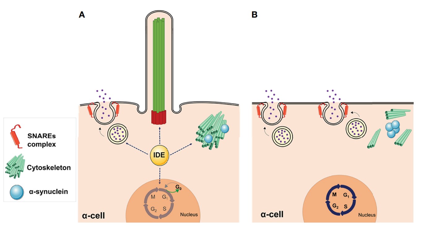 Fig1. Non-proteolytic functions of IDE in α-cells. (A) The abundance of IDE in pancreatic α-cells is relevant for maintaining several cellular functions. (B) Deletion of IDE in mouse α-cells revealed multiple phenotypes. (Marta Pablos, 2022)