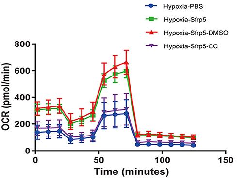 Fig2. Representative images of OCR in Sfrp5-treated, PBS-treated, Sfrp5+Compound C-treated and Sfrp5+DMSO-treated neonatal rat cardiac myocyte cells analyzed by the Seahorse XF.